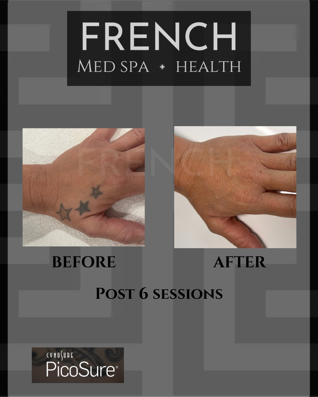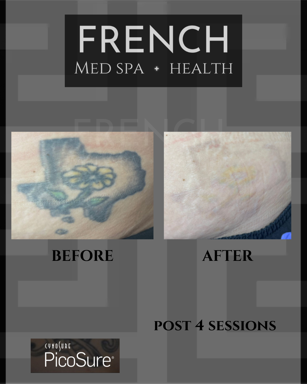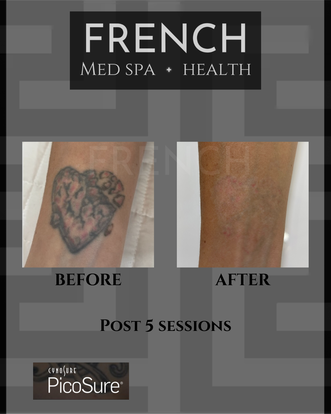 At French Med Spa + Health, we know every tattoo tells a different story, and that means every removal journey is unique. Typically, 4 to 20 sessions leads to optimal results, but your skin care provider may recommend more or less depending on your individual case.